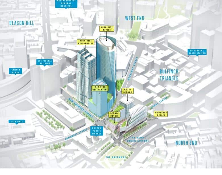 At full buildout, the project will include 812 residential units, 196 hotel rooms, 1.1 million square feet of office space and 85,000 square feet of new retail. Three smaller buildings containing a hotel and condos, boutique office space and multi-story retail will encircle a public plaza next to the Rose Fitzgerald Kennedy Greenway.