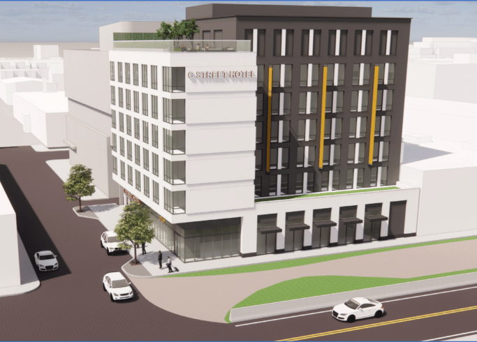 The $26.8 million project, designed by architects Group One Partners of South Boston, calls for a six-story hotel including a roof deck and ground-floor restaurant space.
