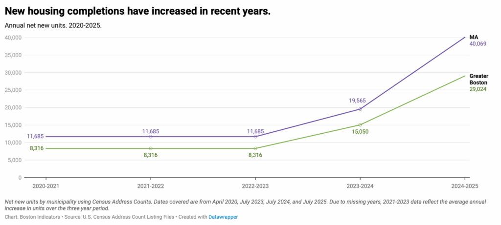 Massachusetts added 40,069 new homes between July 2024 and July 2025, according to a report released Tuesday by the Boston Indicators think-tank at The Boston Foundation.