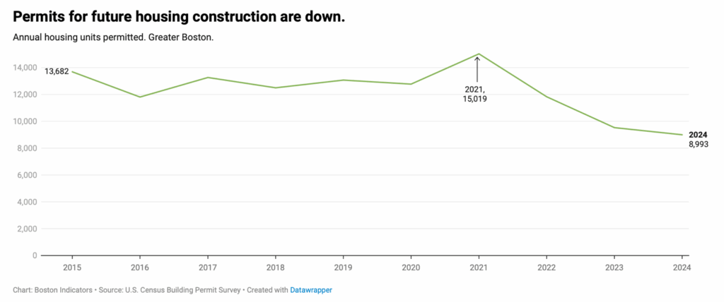 Numbers of new housing permits peaked at 16,019 in Greater Boston in 2021, and have since fell to 8,993 in 2024 – nearly 31 percent less than the average of the last decade. thanks to a much more difficult financing environment and a ratcheting up of affordability requirements in Boston, Cambridge and Somerville.