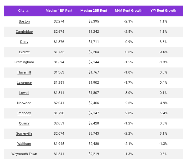 ApartmentList reported that median rents in Boston and Cambridge rose 1.1 percent in the past year and 3.3 percent in Somerville.