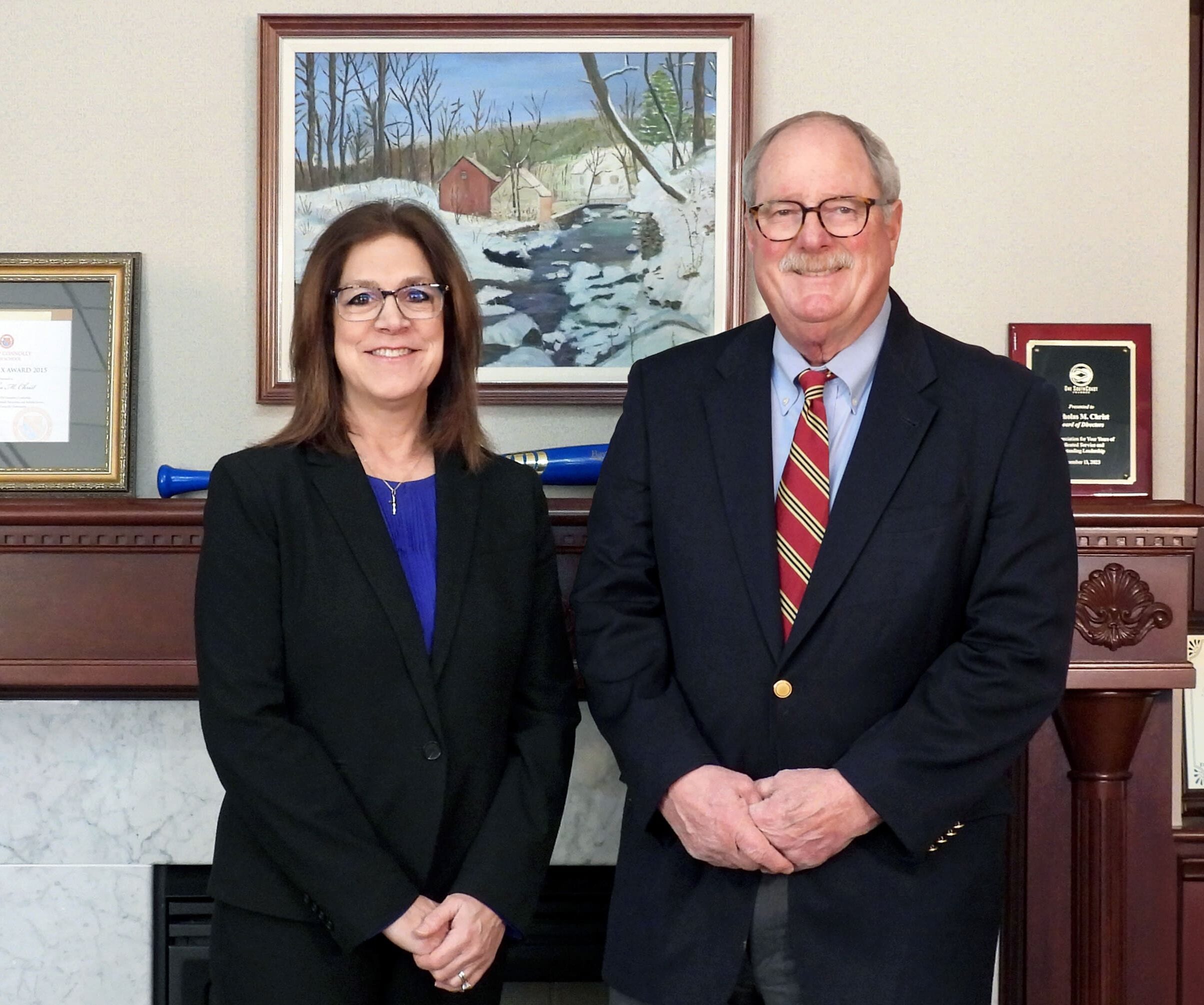 Marie Pellegrino, left, and Nicholas Christ, right, pose for this handout photo to commemorate Pellegrino's naming as the bank's first female president. Photo Courtesy of BayCoast Bank