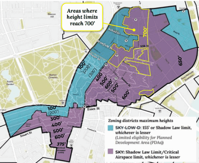The Sky-Low district allows building heights up to 155 feet in sections closest to Boston Common, including the area between Tremont and Washington streets, known as the “Ladder Blocks.” The Sky district, including the bulk of the Financial District and portions of Park Plaza, only limits building heights to comply with laws limiting new shadow on Boston Common, and FAA guidelines on buildings interfering with Logan Airport flight patterns, which are approximately 700 feet.