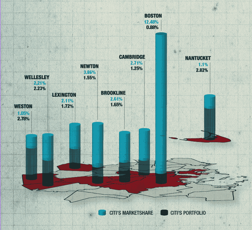 Four of those municipalities also represented areas where Citi was strongest in the town-wide market: Wellesley, Lexington, Brookline, and Newton were in the top 25 best locations for Citi’s market share statewide. Citi made loans in 273 municipalities in Massachusetts overall; Cambridge ranked at No. 36 for Citi, Springfield ranked No. 62 and Boston at No. 65.