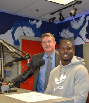 Northern Bank President Jim Mawn and New England Patriots running back Sony Michel pose for a photo in the studios of 98.5 FM.