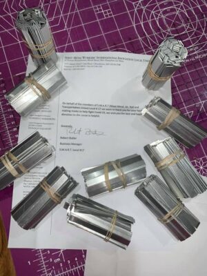 As volunteers across the region sew homemade masks, members of Boston-based Sheet Metal Workers Local 17 are fabricating and donating over 5,000 metal strips a day for the masks’ noses and delivering them to mask-makers. The strips permit a homemade mask to seal more precisely around the wearer’s nose, making for a more effective mask. As of this week, the union has made and donated over 46,000 nose pieces so far.