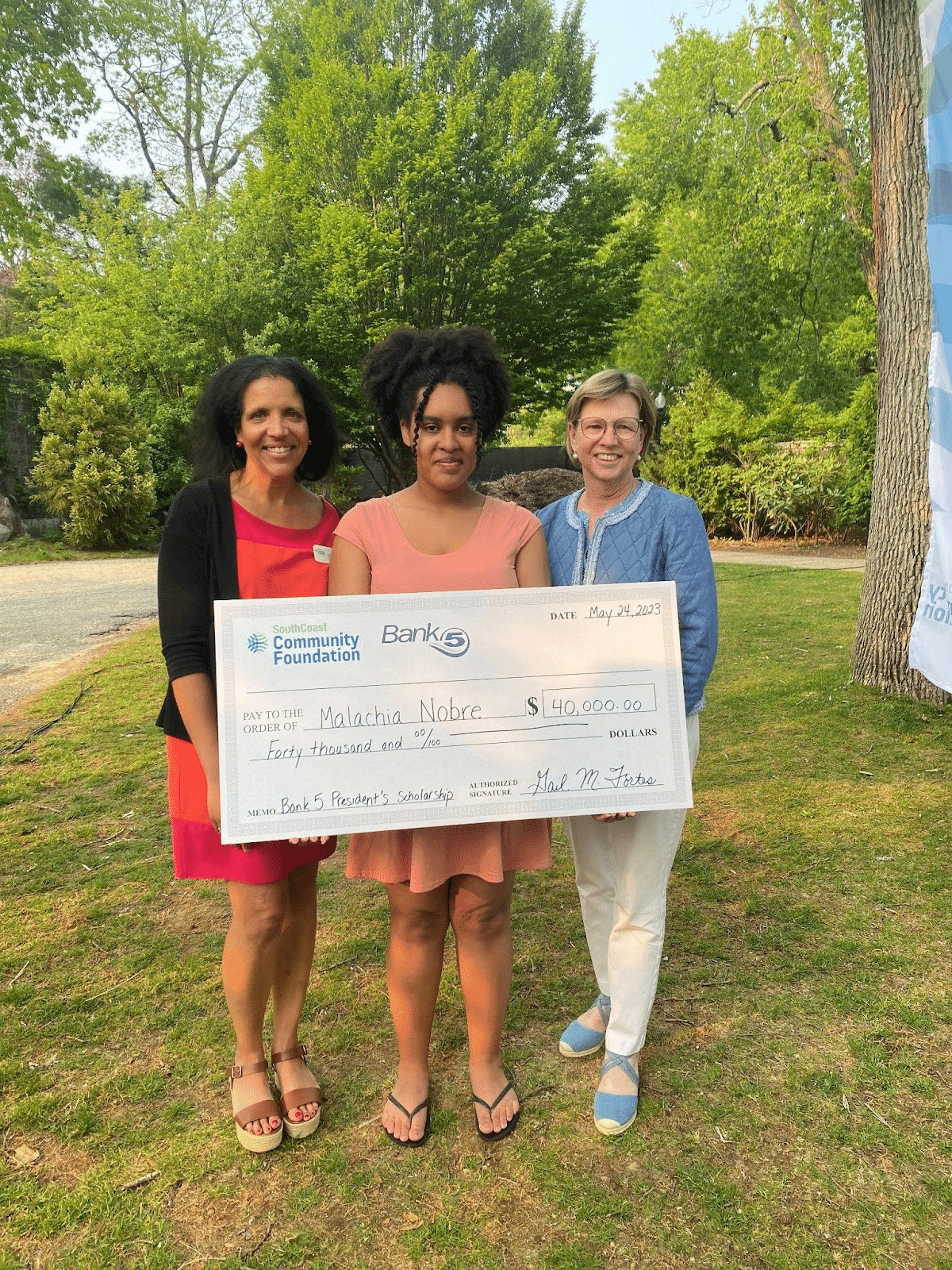 From left to right: Gail Fortes, SouthCoast Community Foundation board chair, Malachia Nobre, BankFive scholarship recipient, Anne Tangen, BankFive president & CEO, pose with a novelty check for $40,000 to mark the bank's gift of a scholarship to Nobre. Photo courtesy of BankFive