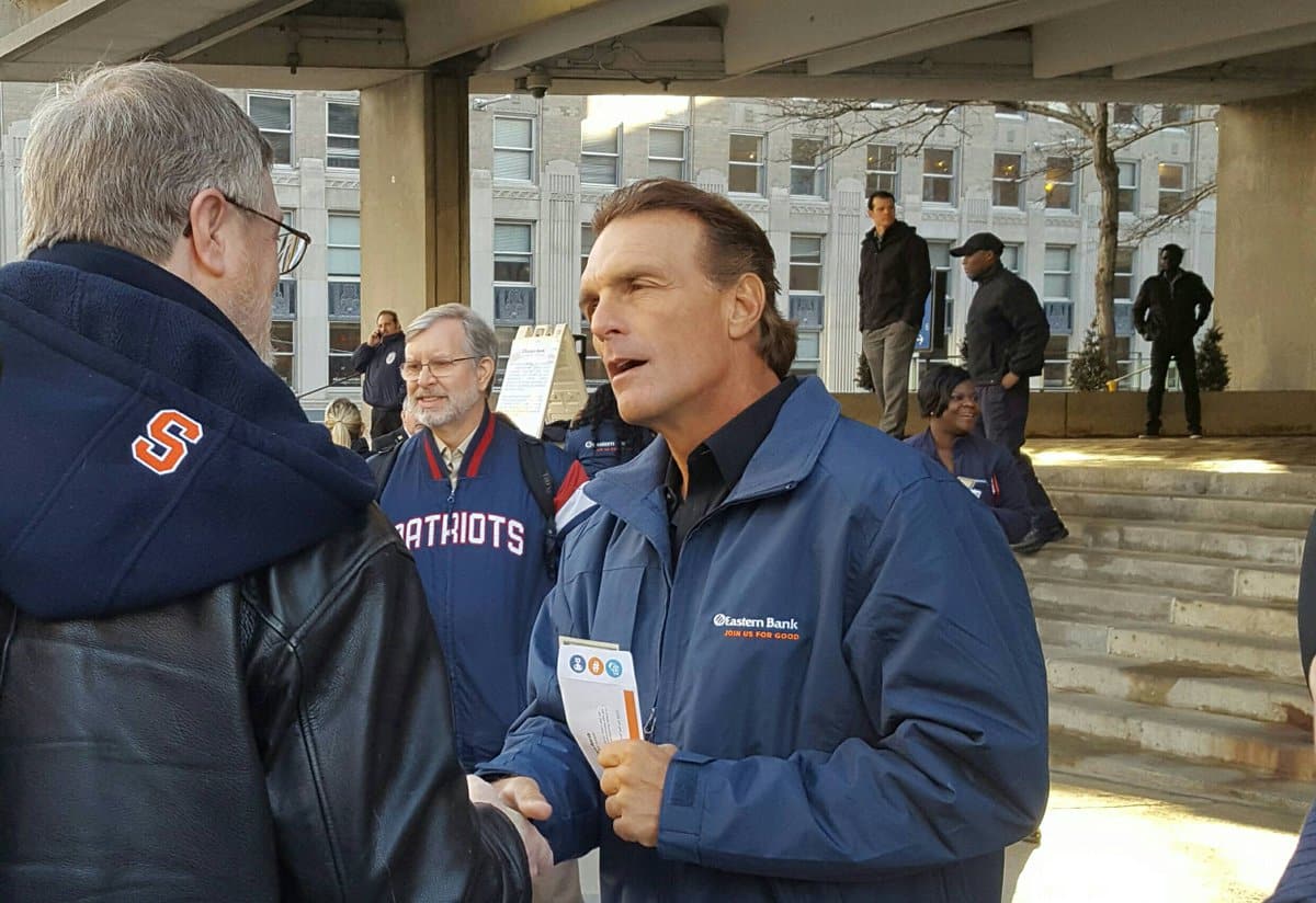 Eastern Bank teamed up with former Boston College and NFL quarterback Doug Flutie and handed out $10,000 worth of $5 bills to passersby at Faneuil Hall and Back Bay as part of its Join Us for Good campaign, with hopes that the recipients would pay it forward.