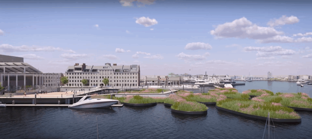 Living shorelines that buffer wave action are included in a proposed downtown Boston waterfront resiliency plan. Image courtesy of Wharf District Council