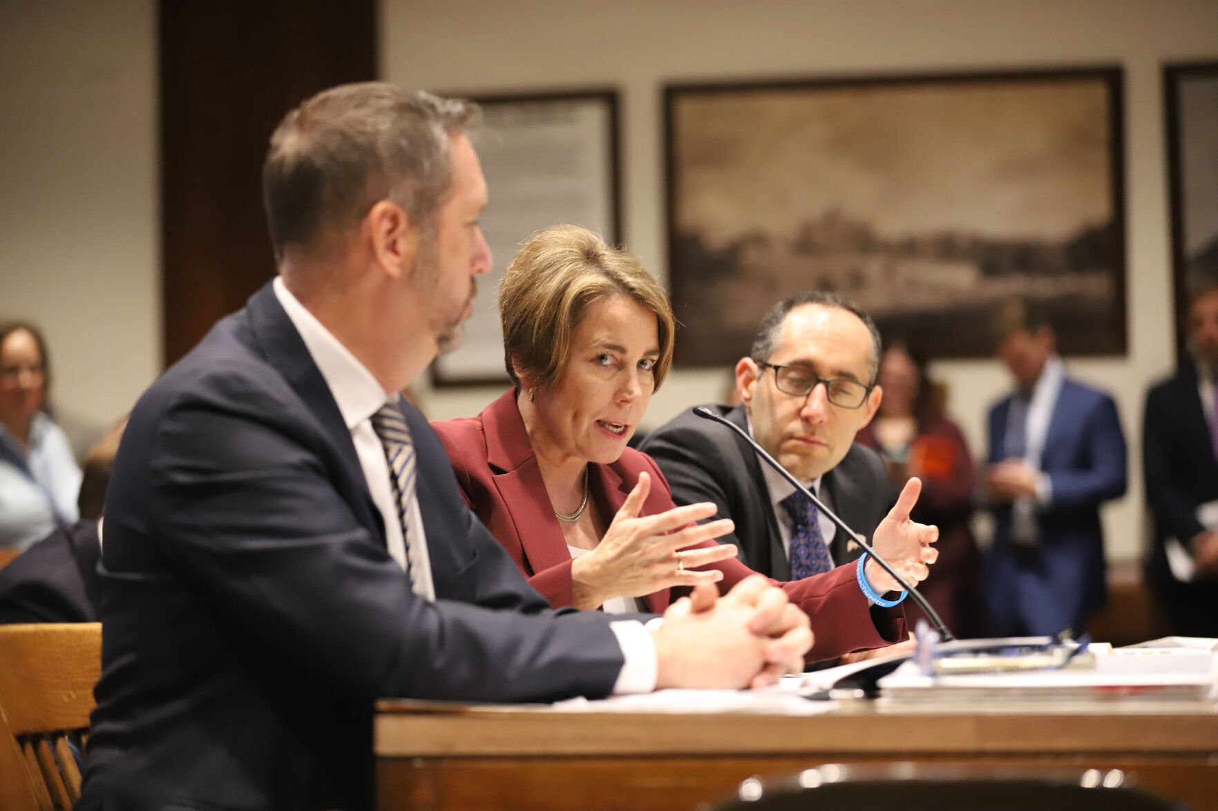 Gov. Maura Healey (center) speaks at a State House hearing on Oct. 30, 2025. She's flanked by Administration & Finance Secretary Matthew Gorzkowicz (left) and Economic Development Secretary Eric Paley (right). Photo by Ella Adams | State House News Service