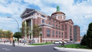 Adaptive reuse of the Blessed Sacrament church will preserve the building’s historic facade, while adapting the church’s nave into a 200-capacity community space. Image courtesy of Dimella Shaffer