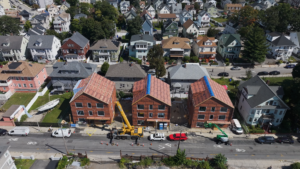 Passive House-style building shells are complete at a 12-unit affordable housing project being built on formerly vacant, city-owned properties at 104-108 Norwell St. in Boston’s Dorchester neighborhood.