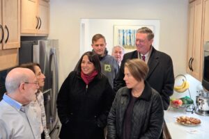 Gov. Maura Healey, bottom right, Lt. Gov. Kim Driscoll, center, and state Housing Secretary Ed Augustus, rear right, tour an accessory dwelling unit in Lexington on Dec. 10, 2025. Photo by Sam Lattof | Banker & Tradesman Staff