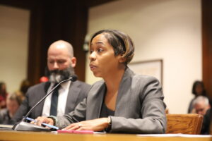 Attorney General Andrea Campbell testifies before the Judiciary Committee at the State House on Nov. 25, 2025. Photo by Ella Adams | State House News Service