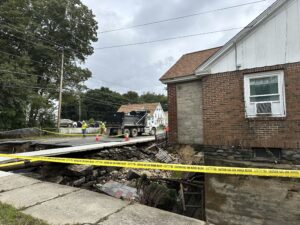 Yellow caution tape surrounds a sinkhole in front of a Leominster house on Sept. 12, 2023, after a storm flooded the city with more than 9 inches of rain the night before. Photo by Michael Casey | Associated Press