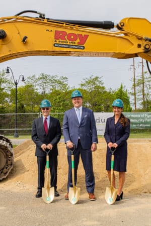 North Easton Savings Bank Chairman Edward Joubert (left), President and CEO Rich Spencer (middle) and COO Aileen Zec pose for a photo at a ground-breaking event for the bank's Plymouth branch in May 2023. Photo courtesy of North Easton Savings Bank