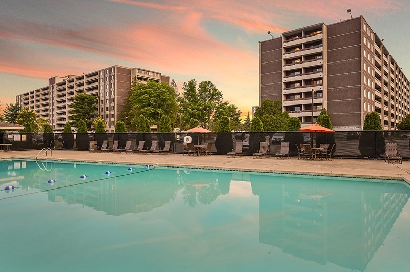 The market-rate complex built in the early 1970s and comprises three eight-story buildings on a 20-acre site, a community room, outdoor pool, gym, basketball court and tennis court.