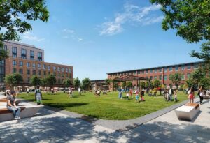 The first phase of the project also includes a 1-acre Village Green. The site near the corner of Needham and Oak street previously included a strip mall owned by Northland. The Saco Pette Mill building, previously the Clarks Americas headquarters prior to the shoe company’s relocation to Waltham, was originally envisioned to remain as 193,000 square feet of office space.