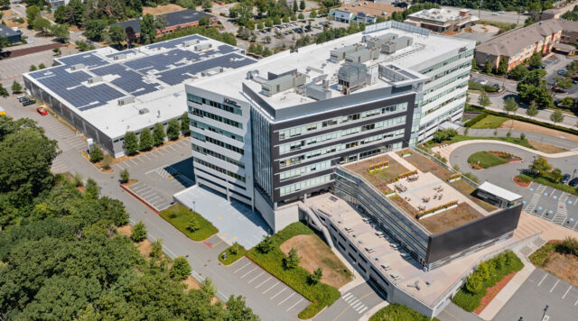 Keurig Dr Pepper’s two-building head office and R&D headquarters at 53-63 South Ave. in Burlington sold last week for $84.5 million in a deal brokered by Newmark, a 29 percent discount over its previous sale. Photo courtesy of Newmark