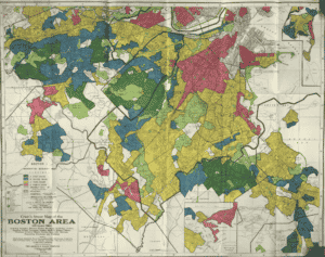 A map of mortgage lending risk in Greater Boston, produced by the federal Home Owners’ Loan Corp. in 1938. Image courtesy of the Mapping Inequality Project