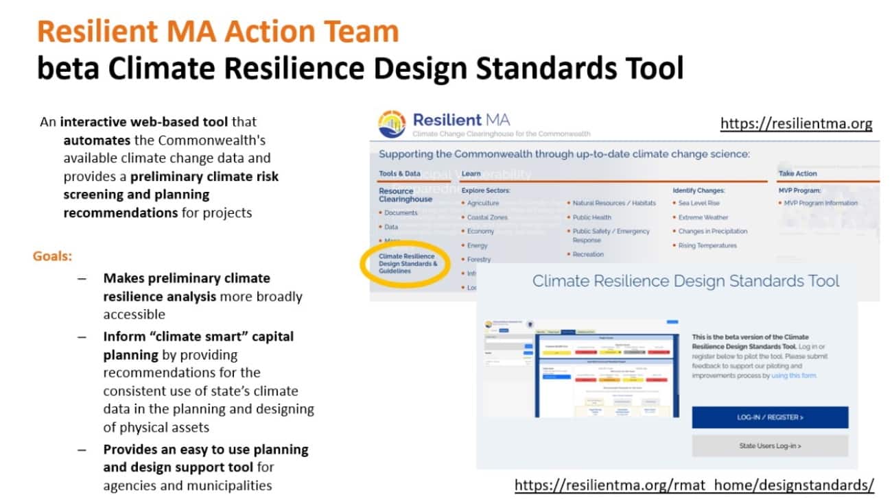 The Resilient MA Action Team Climate Resilience Design Standards Tool aims to get municipal leaders to think about how climate change over the coming decades might affect developments that are still in the planning stages and for the state to share mitigation recommendations.