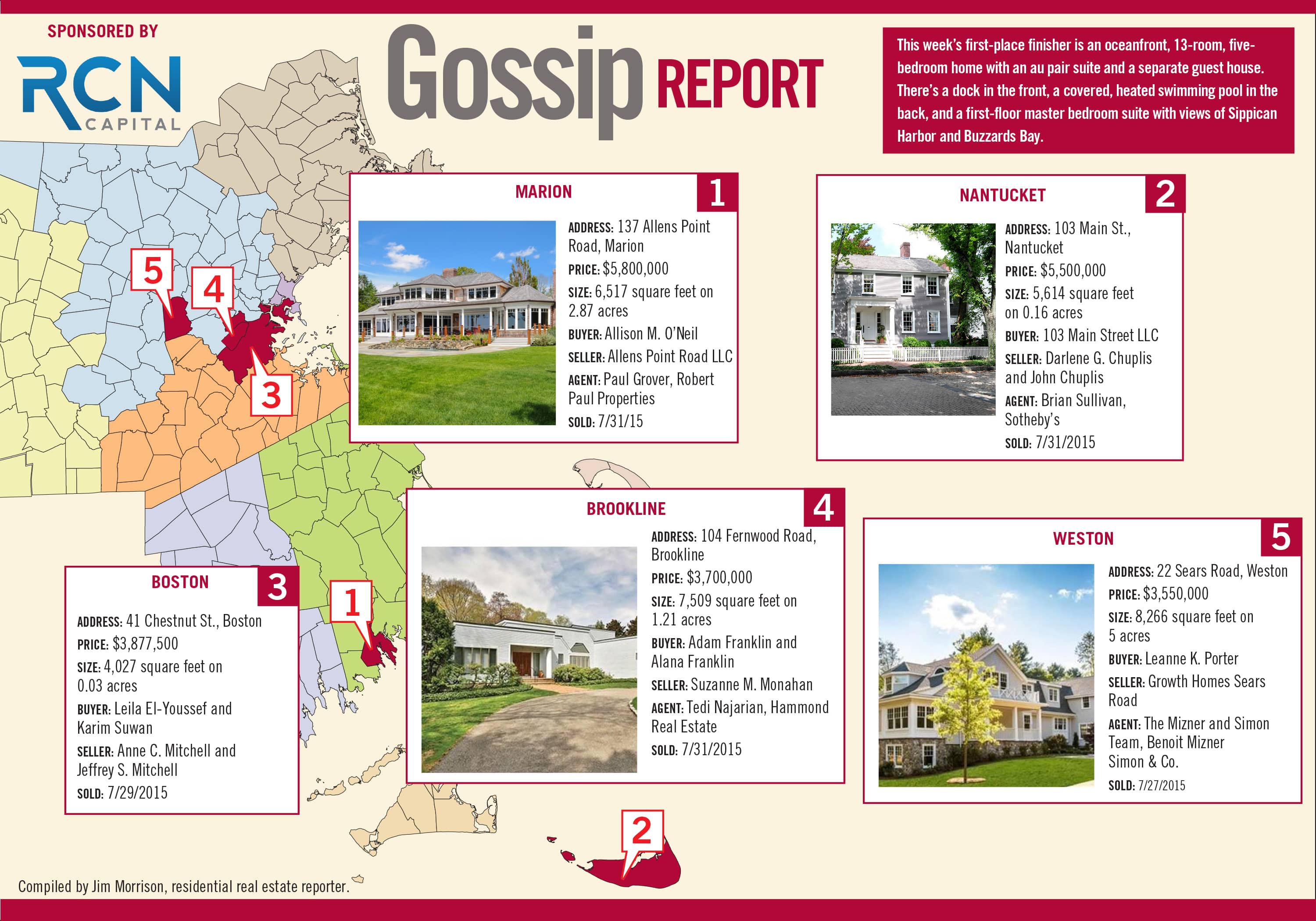 A $5.8 million, 13-room estate with a view of the bay takes the No.1 spot in next week’s Gossip Report.