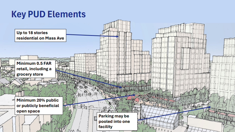 In Porter Square, a planned unit development [PUD] overlay district would permit buildings up to 18 stories on Massachusetts Avenue, while requiring a 20 percent open space component.