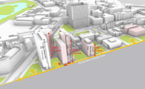 And the West Quad academic building, previously approved at 140,000 square feet, would be replaced with an 80,000 square-foot, 135-foot tall dorm including 300 student beds.