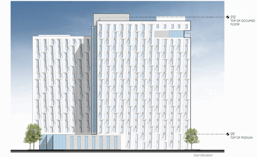 The Pike Residence Hall, replacing surface parking, was approved for a 190-foot-tall, 126,000 square-foot tower containing 400 beds. The school now proposes a 212-foot-tall, 222,000 square-foot dorm containing 964 beds.