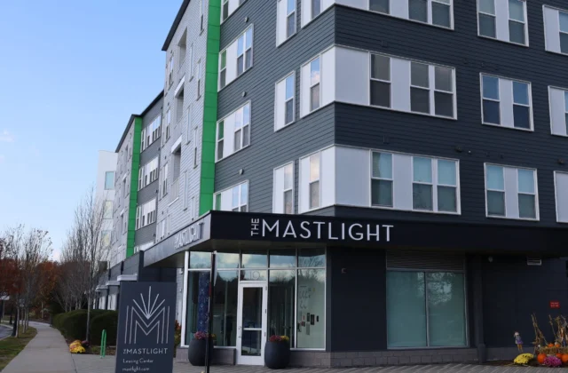 The Mastlight apartment complex, located next to the former South Weymouth Naval Air Station. Photo by Maria Pemberton | CommonWealth Beacon / CC BY-ND 4.0
