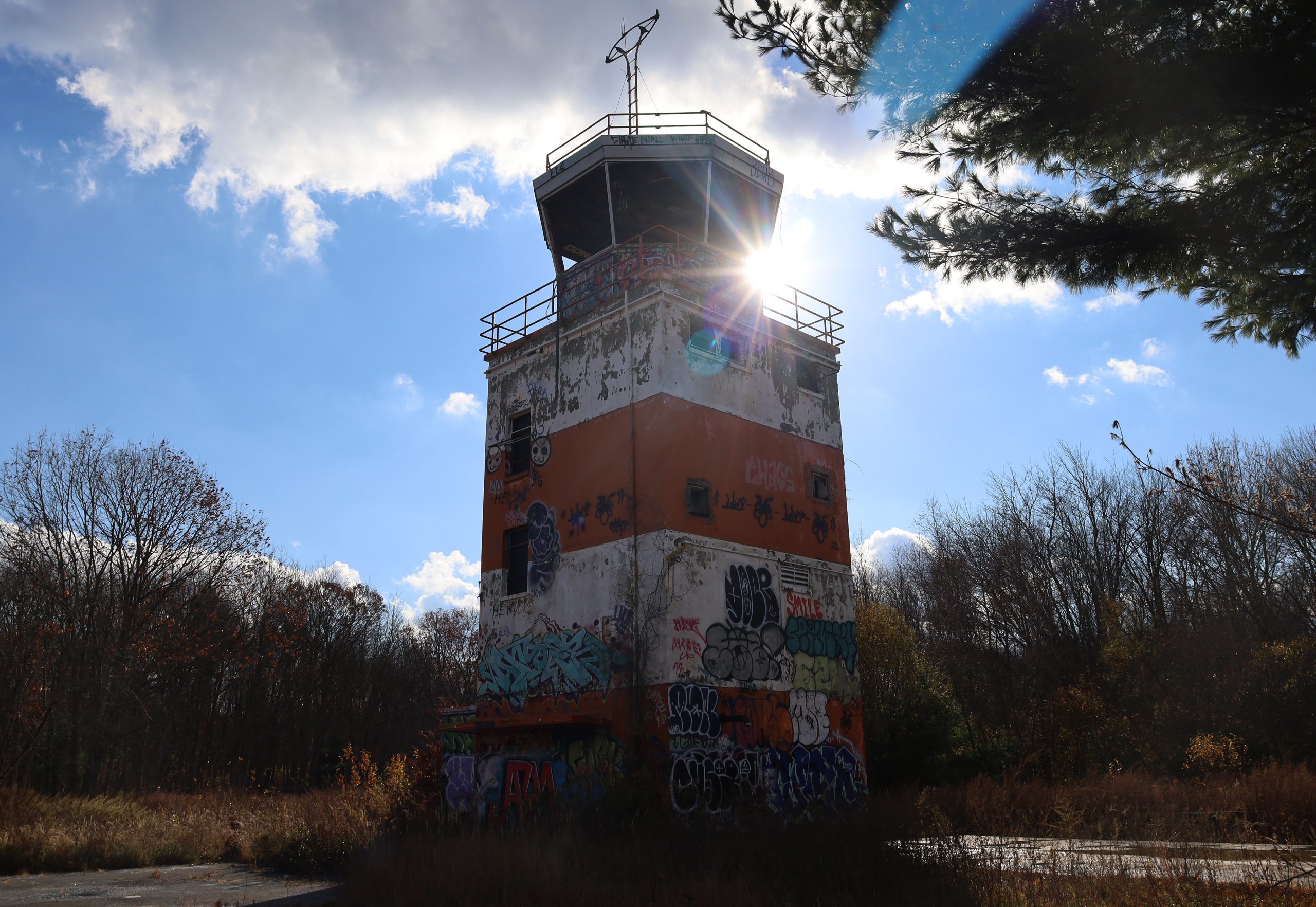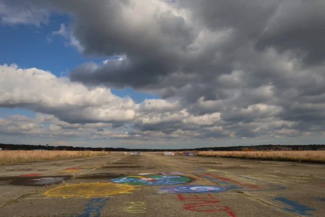 The empty, graffiti-covered runway at the former South Weymouth Naval Air Station. Photo by Maria Pemberton | CommonWealth Beacon / CC BY-ND 4.0